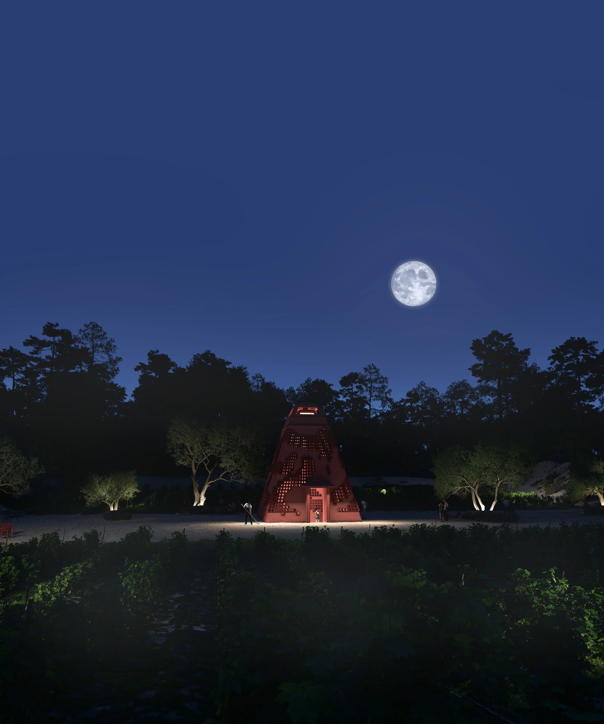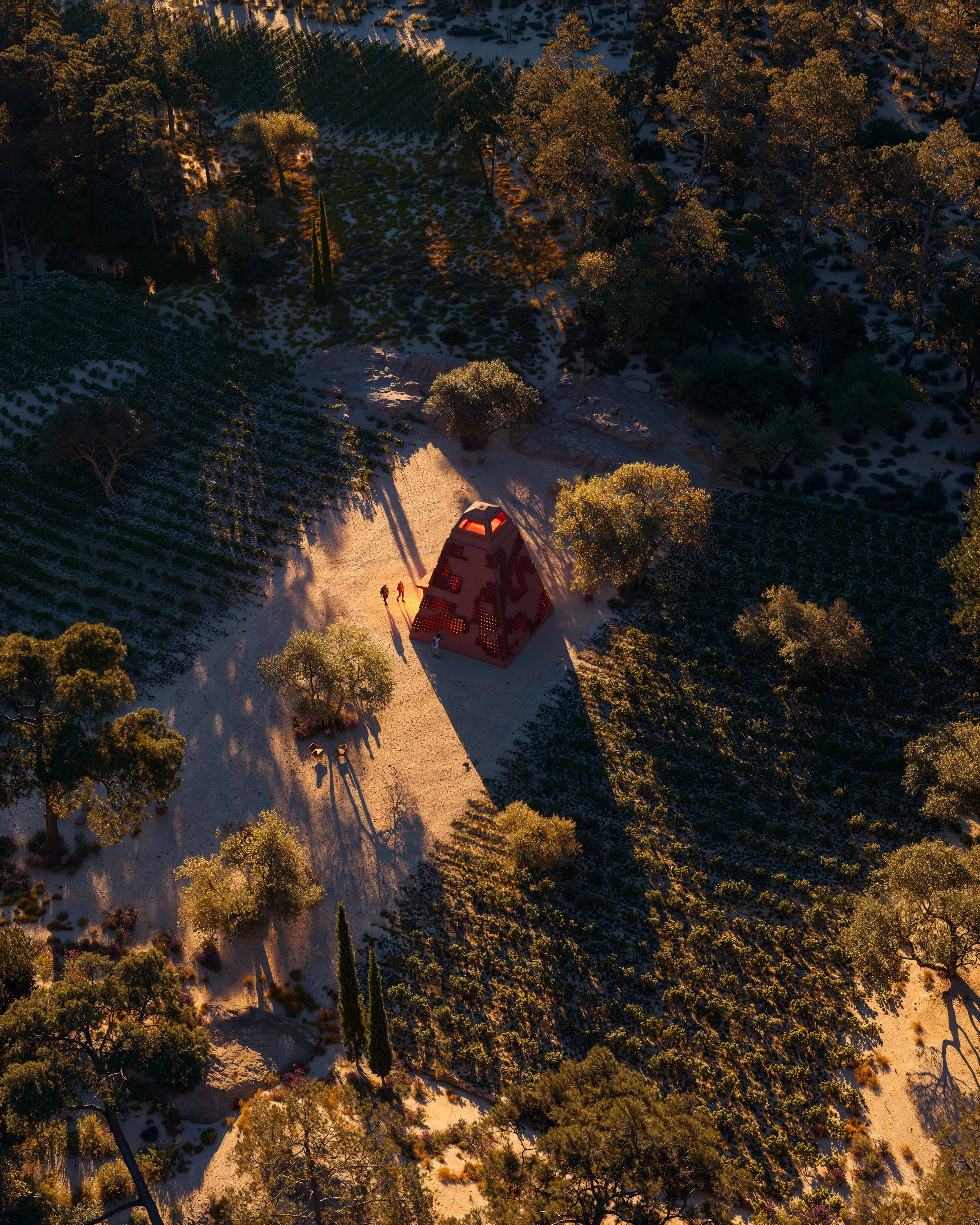 Designed as a dialogue between sound and light, the KORA Pavilion stands in a vineyard clearing as both sculpture and instrument.
